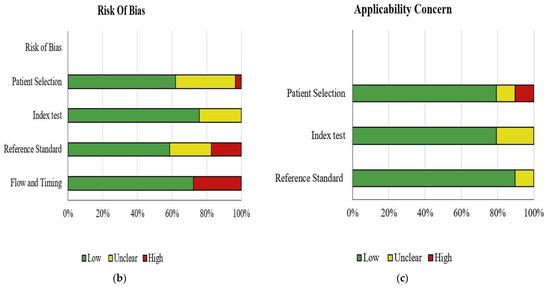 Risk of bias and applicability of concern of the 29 included studies. Image (a) shows the bias of every paper while image (b,c) show the frequency of a paper having a bias and their applicability concern respectively. These images show the quality of the papers used in the analysis.
