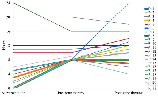 Hours off ventilation per day at presentation, before, and after gene therapy. Pt: Patient.