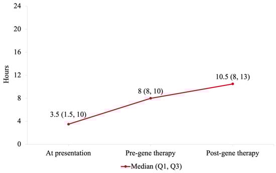 The median (Q1, Q3) hours off ventilation per day at presentation, before, and after gene therapy.