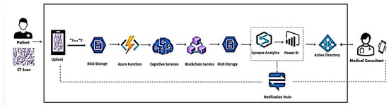 - Image Upload and Encryption: Patients upload their CT images through a user-friendly mobile app or web interface, which is secured through robust authentication and authorization mechanisms to prevent unauthorized access. The uploaded images are then encrypted and transferred to a secure and scalable cloud storage solution, Azure Blob Storage, which provides an additional layer of protection for patient data.
