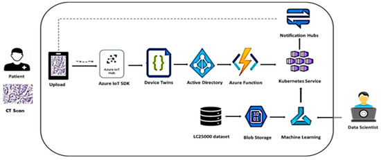 For cancer classification [13], the framework leverages Azure Machine Learning to train and deploy advanced machine learning models. Patients upload their CT images via a user-friendly interface, and these images are processed and analyzed using pre-trained models such as InceptionV3, ResNet, DenseNet, and MobileNet. These models are trained on the LC25000 dataset, a comprehensive collection of histopathological images used for evaluating cancer classification algorithms. The models are deployed as web services using Azure Functions, which handle API calls and manage access to the classification system.