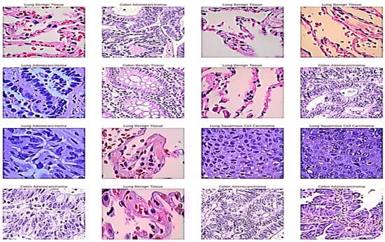 The LC25000 dataset [20] is a comprehensive collection of histopathological images used primarily for research in the field of computational pathology, specifically in the automated classification of lung and colon cancer. This dataset is widely recognized for its contribution to the development and evaluation of machine-learning models aimed at distinguishing between different types of cancerous tissues. The LC25000 dataset comprises 25,000 high-resolution histopathological images. All images are 768 x 768 pixels in size and are in JPEG file format. These images are evenly distributed between lung and colon tissues, ensuring a balanced dataset for training and evaluating machine learning models. It includes five categories: Lung Adenocarcinoma (LUAD), Lung Squamous Cell Carcinoma (LUSC), Colon Adenocarcinoma (COAD), Colon Benign Tissue (BCT), and Lung Benign Tissue (LBT), Figure 3 shows a sample.