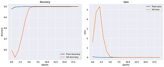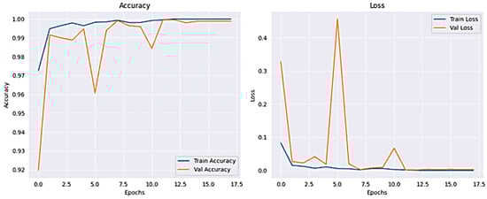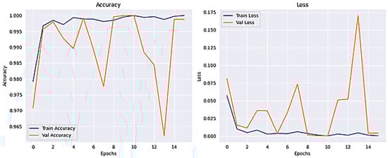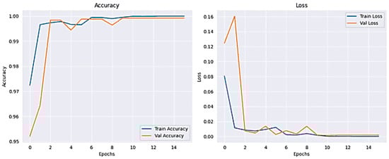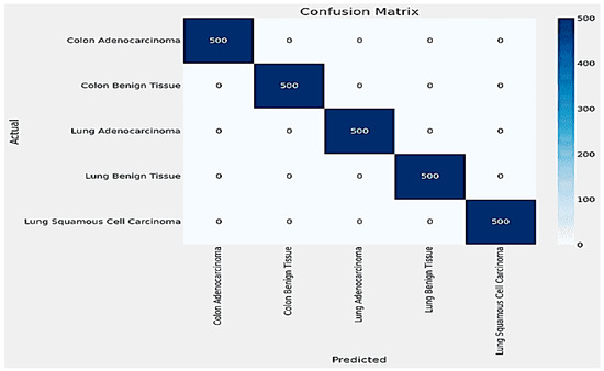 The results for classifying Lung and Colon Cancer using the MobileNet model demonstrate exceptional performance metrics. The training and validation loss plots indicate effective learning, with both losses converging to low values by the end of the training process. Similarly, the accuracy plots reveal that the model attains near-perfect accuracy early on and maintains it throughout the training, as shown in Figure 12. The confusion matrix further corroborates these findings, showing accurate classification for the classes involved, with minimal misclassifications observed, as shown in Figure 13. The training time was 4658.02 s, and the testing time was 19.66 s, reflecting a computationally efficient process. The model achieved a validation accuracy of 100% and a training accuracy of 100%, indicating excellent generalization to the validation set without significant overfitting, as shown in Table 5. These results suggest that the MobileNet model is highly effective for the given classification task, providing reliable and accurate predictions, which is crucial for practical applications in medical diagnostics.