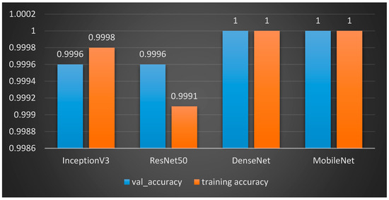 Both DenseNet and MobileNet achieved perfect scores across all metrics, with 100% validation and training accuracy, precision, recall, and F1 score. This level of performance suggests that these models perfectly classified all cases in both training and validation datasets, making no errors. DenseNet’s densely connected layers likely contributed to this high accuracy by improving feature reuse, while MobileNet, optimized for efficiency, demonstrated that even lightweight models can achieve top-tier performance in medical image classification.