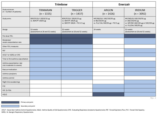 Clinical programs, phase III trials. A comparison of primary and secondary endpoints of two triple therapies currently registered in Europe for the treatment of asthma.