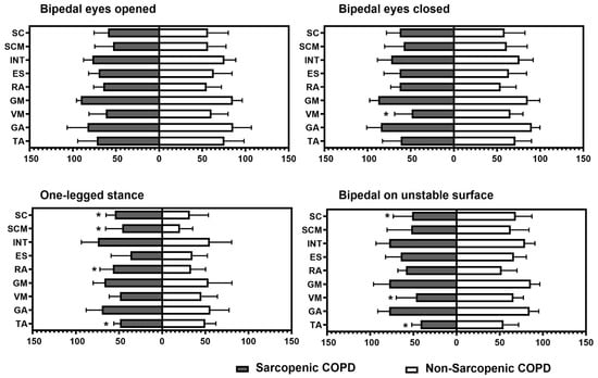 Figure 1 represents the percentage of muscular activation using surface electromyography across the four static positions, according to the presence of sarcopenia. COPD individuals with sarcopenia exhibited a higher activation of scalene, sternocleidomastoid, and abdominal muscles during the one-legged stance and a lower activation of tibialis anterior during both the one-legged stance and the bipedal stance on an unstable surface. In addition, those individuals with sarcopenia presented lower vastus medialis activation during the bipedal stance with the eyes closed and the bipedal stance on an unstable surface (p ≤ 0.04 for all).