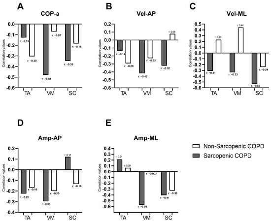 Correlation coefficients between force platform variables (COP.a; Vel-AP; Vel-ML; Amp-AP and Amp-ML; represented by the letters (A–E), respectively) and the percentage of muscle activation during the bipedal stance on an unstable surface in individuals with and without sarcopenia. COP-area: center of pressure displacement area; Vel-AP: center of pressure displacement velocity in anterior–posterior direction; Vel-ML: center of pressure displacement velocity in medial–lateral direction; Amp-AP: amplitude of the movement of COP in antero-posterior direction; Amp-ML: amplitude of the movement of COP in medial–lateral direction; TA: tibialis anterior, VM: vastus medialis; SC: scalene.