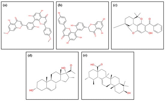 Structures of the selected natural product compounds: (a) M1, (b) M2, (c) M3, (d) M4, and (e) reference compound (Ursolic acid).