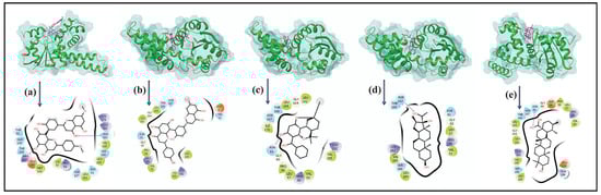 2D and 3D interaction profiles for the protein–ligand docked complexes; (a) DosR-M1, (b) DosR-M2, (c) DosR-M3, (d) DosR-M4, and (e) reference compound DosR-(Ursolic acid). Three-dimensional and 2D structures were generated from Maestro 12.8 version. In the 3D structure, the compound is represented by ball and stick model (pink color), and protein is represented by ribbon in constant green color. In 2D interaction diagram, hydrogen bonds (violet arrows), hydrophobic (green), positive (violet), negative (red), polar (blue), and glycine (creamy white) interactions are presented to be involved in docked complexes.