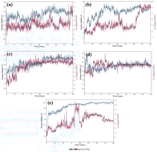 Root mean square deviation plot for the backbone atoms of DosR protein with selected natural product compounds: (a) DosR-M1, (b) DosR-M2, (c) DosR-M3, (d) DosR-M4, and (e) reference compound DosR-(Ursolic acid), fit on selected target protein were extracted from 200 ns MDS trajectories of different docked complexes.