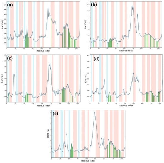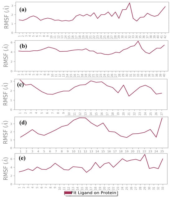 RMSF plot generated for the DosR protein docked with selected natural product compounds and reference molecule, i.e., (a) M1, (b) M2, (c) M3, (d) M4, and (e) reference compound (Ursolic acid).