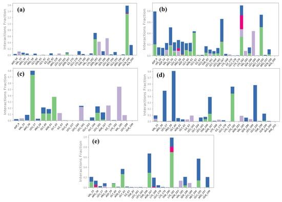 Protein–ligand interactions mapping (green: hydrogen bonding; grey: hydrophobic interaction; pink: ionic interaction; blue: water bridges) for DosR protein docked with selected natural product compounds, i.e., (a) DosR-M1, (b) DosR-M2, (c) DosR-M3, (d) DosR-M4, and (e) reference compound DosR (Ursolic acid), extracted from 200 ns Molecular dynamic simulations.