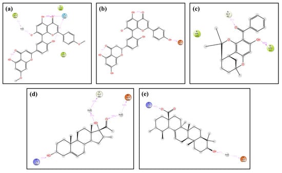A detailed schematic representation of atomic interaction of ligand of natural product compounds and the reference molecule, i.e., (a) M1, (b) M2, (c) M3, (d) M4, and (e) reference compound (Ursolic acid), docked with DosR protein. On the chosen trajectory (0.00 to 200.01 nsec), interactions that occur more than 30.0% of the simulation period are displayed.