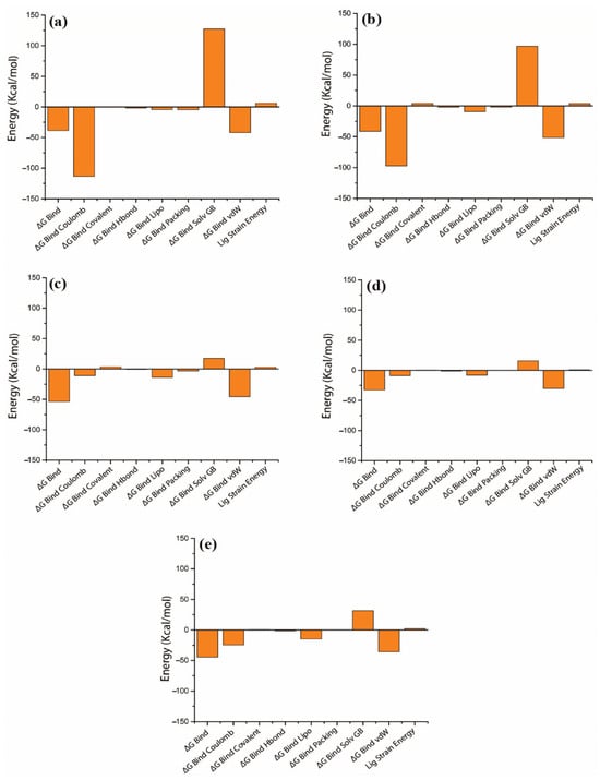 In the current study, MM/GBSA calculation was performed using energy-stabilized frames from the last 20 ns of MDS. To calculate the net binding free energy, “thermal_mmgbsa” Python script was used. Key energy components, including ΔGBind Coulomb, ΔGBind covalent, ΔGBind H-bond, ΔGBind lipo, ΔGBind vdW, and ΔGBind Solv GB, were evaluated through MM/GBSA analysis, which was carried out using the VSGB 2.0 solvation model [,]. To ensure statistical reliability, the computed binding energy values were averaged, and their standard deviations were determined. The MM/GBSA method has been extensively validated and applied in computational studies, demonstrating its efficacy in predicting ligand–protein binding affinities.