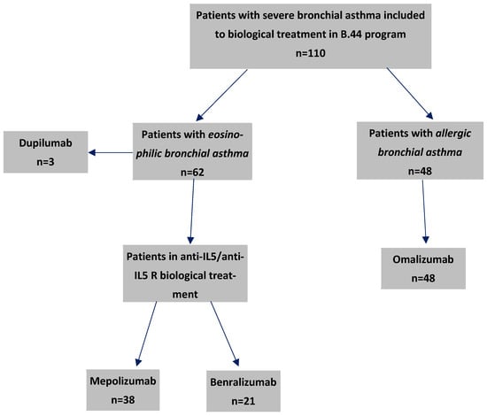 This retrospective, single-centre study was performed at the Department of Internal Diseases, Allergology and Clinical Immunology in the University Clinical Hospital named K. Gibińskiego Medical University of Silesia in Katowice, Poland. The study enrolled 59 patients: 38 of them started treatment with mepolizumab between July 2018 (in-clinic introduction) and December 2023 and 21 of them with benralizumab between December 2019 (in-clinic introduction) and December 2023. Reslizumab was omitted from our study due to its unavailability in Poland. In turn, dupilumab was excluded from our analysis because of the small number of patients treated with this drug at our clinic. The study included patients who met the criteria for initiating the biologic treatment of severe asthma with benralizumab or mepolizumab in accordance with the requirements that are mandatory in Poland. The eligibility criteria for treatment with benralizumab and mepolizumab according to the guidelines of the Polish Ministry of Health are as follows:
