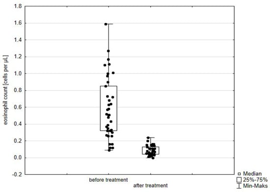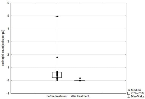The parameters included were leukocyte, eosinophil, neutrophil, monocyte, and platelet counts, as well as inflammatory markers—CRP and ESR. Determinants were assessed at point 0 (before the initiation of biological treatment) and point 1 (after 6 months of therapy).