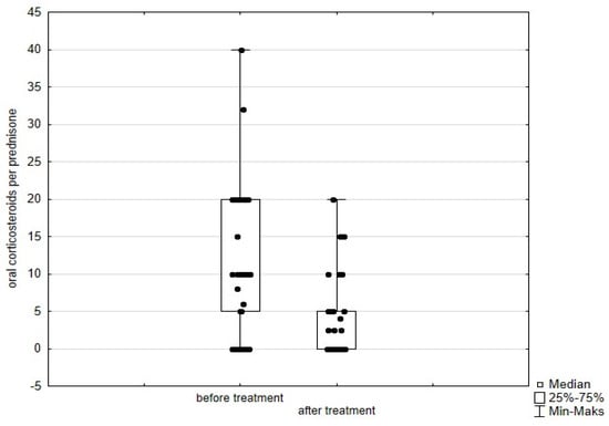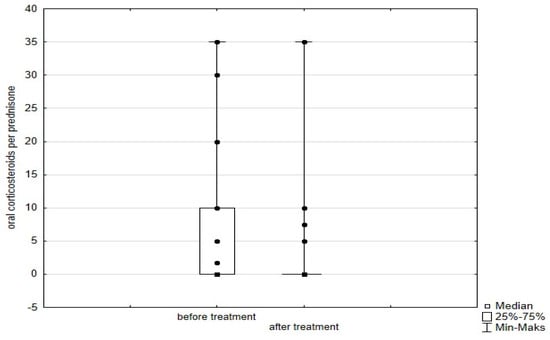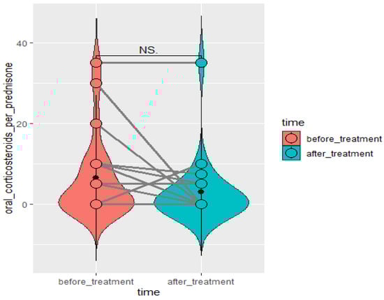 Change in daily OCS dose in time in patients treated with benralizumab. Wilcoxon test for paired samples, p = 0.0506. NS—not statistically significant.