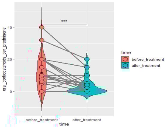 Daily dose of oral corticosteroids per prednisone in patients treated with benralizumab. Wilcoxon test for paired samples, p = 0.0506.