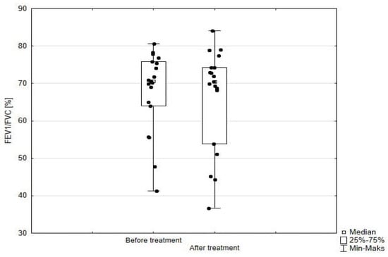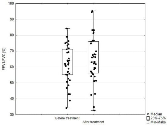FEV1/FVC in patients treated with benralizumab. Wilcoxon test for paired samples, p = 0.69.