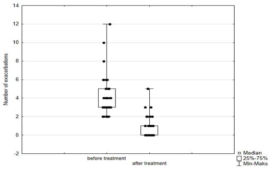Number of exacerbations in patients treated with mepolizumab. Wilcoxon test for paired samples, p < 0.01.