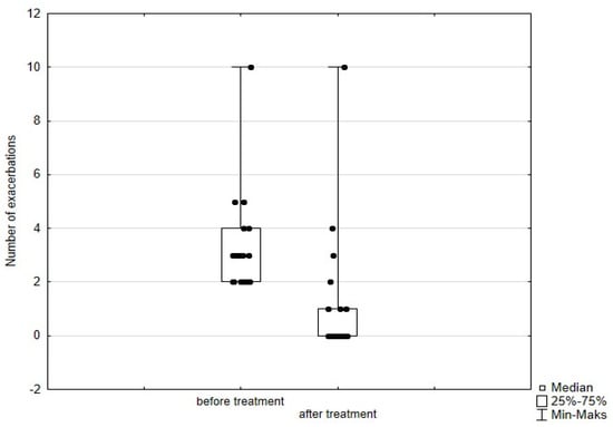 Significant improvement (p < 0.05) was found in several parameters throughout the 6-month observation, including a drop of eosinophil (Figure 2), a reduction in oral glucocorticosteroid dose—from a median dose of 10 mg per prednisone to complete withdrawal. (Figure 3 and Figure 4), a decrease in ACQ (Figure 5) and an increase in miniAQLQ (Figure 6) questionnaire scores, and an increase in spirometry parameters indicative of obstruction (FEV1/FVC) (Figure 7). A decrease in the number of exacerbations was also observed (Figure 8). In contrast, there was no statistically significant difference in the number of leukocytes, lymphocytes, platelets, neutrophils, inflammatory measures (CRP-c-reactive protein, ESR-red blood cell sedimentation reaction), BMI, and absolute values of FEV1 and FVC.