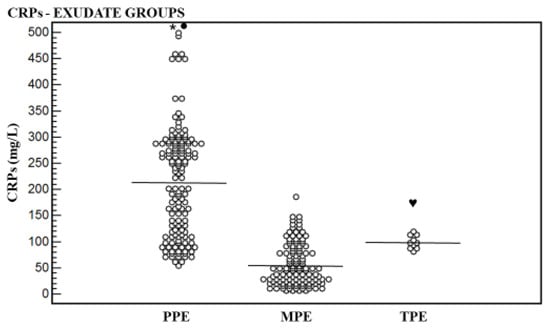 - Qu, S.Y.; Zhang, Y.; Wu, S.; Wang, M.M.; Liu, L.L.; Yang, X.M.; Shan, H.L.; Yang, J.L.; Chen, P.; Ti, X.Y. Combined analysis of C-reactive protein in pleural fluid and serum is effective in the differential diagnosis of exudative pleural effusions. Ann. Transl. Med. 2021, 9, 1183. [Google Scholar] [CrossRef]