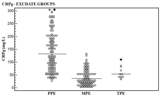 - Kogan, Y.; Sabo, E.; Odeh, M. Diagnostic value of C-reactive protein in exudative pleural effusions. Eur. Respir. J. 2019, 54 (Suppl. S63), PA625. [Google Scholar] [CrossRef]