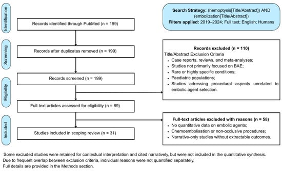 A literature search was conducted in the PubMed database on December 20, 2024, using the following query: (hemoptysis[Title/Abstract]) AND (embolization[Title/Abstract]).