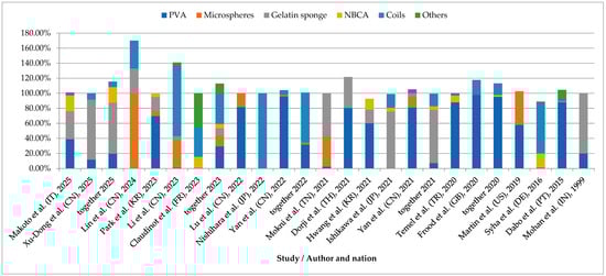 1 Polyvinyl alcohol (PVA), N-butyl-2-cyanoacrylate (NBCA), Gelatin sponges (GS), Non-applicable (N/A). 2 Complication rates represent the combined total of major and minor complications reported in each study.