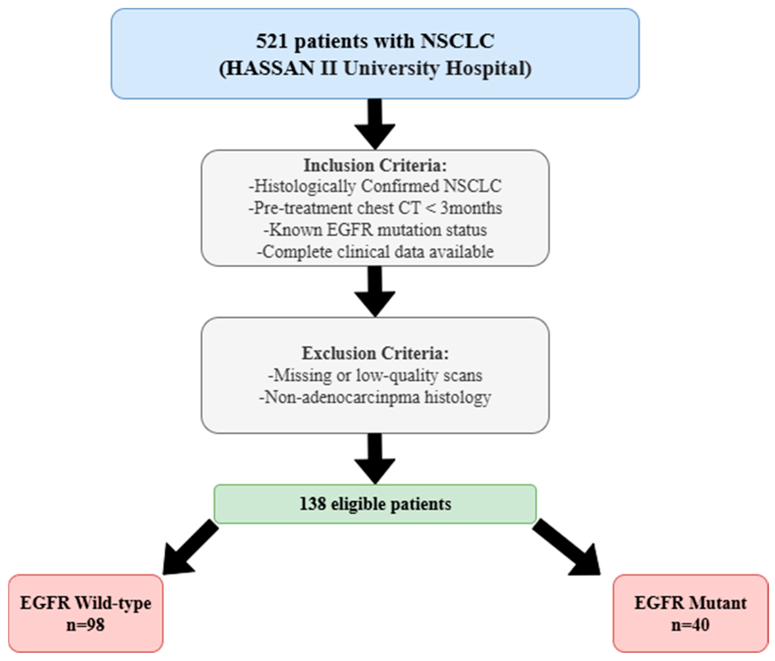 Data were retrospectively collected from 521 patients with histologically confirmed NSCLC treated at the Hassan II University Hospital. Eligibility was contingent upon the availability of a pre-therapeutic chest CT conducted within 3 months prior to biopsy or surgical intervention, a confirmed EGFR mutation status, and complete clinical data. Only patients with histologically confirmed lung adenocarcinoma were included, as this histological subtype accounts for the majority of EGFR mutations in NSCLC and ensures the biological relevance of the predictive modeling. Patients were excluded if CT data were incomplete, if imaging was compromised by artifacts, or if histology was inconsistent with adenocarcinoma. Based on these criteria, 138 patients were included: Among the entire cohort, 98 patients were identified with wild-type EGFR, while 40 patients harbored activating EGFR mutations. Model evaluation was conducted exclusively via stratified five-fold cross-validation on the full dataset (