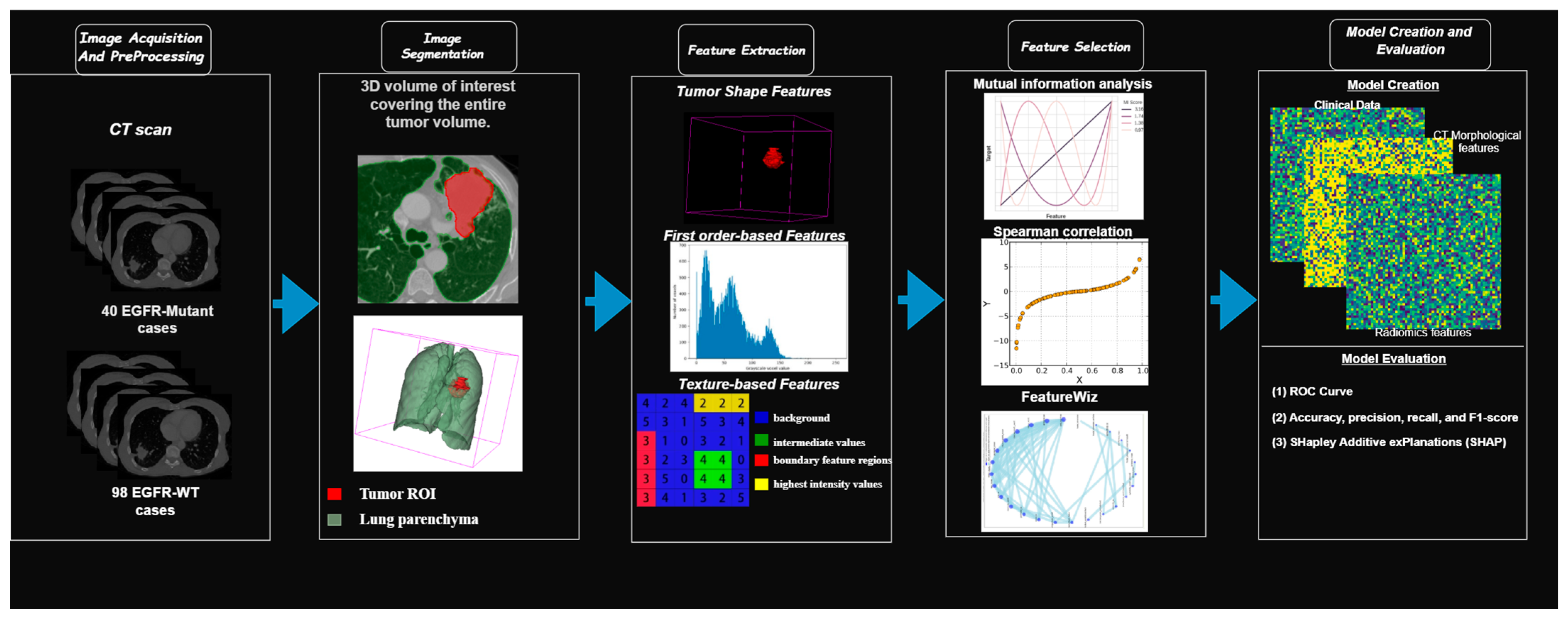 The methodological workflow followed in this study consisted of several integrated steps: acquisition of standardized high-resolution chest CT scans (120 kVp, 100–200 mAs, slice thickness 1–1.25 mm, lung and mediastinal kernels, venous contrast phase at ~70 s); tumor segmentation using semi-automatic tools with expert validation in 3D Slicer (version 5.6.2; an open-source platform for medical image segmentation and radiomics analysis) and ITK-SNAP (version 4.0.1); extraction of radiomic features with PyRadiomics (version 3.1.0), including shape, intensity, and texture metrics such as the Gray-Level Co-occurrence Matrix (GLCM), Gray-Level Run Length Matrix (GLRLM), Gray-Level Size Zone Matrix (GLSZM), Gray-Level Dependence Matrix (GLDM), and Neighborhood Gray-Tone Difference Matrix (NGTDM); feature selection via mutual information, Spearman correlation filtering (where features with r > 0.85 were considered redundant and one of them was removed to reduce collinearity), and the FeatureWiz algorithm. It is important to note that this threshold of Spearman correlation (r > 0.85) was applied only for redundancy filtering among radiomic variables, while the correlation coefficients reported later in the Results section reflect the individual association of selected features with EGFR mutation status, which are naturally more moderate, and training/evaluation of five Random Forest classifiers using different feature subsets. Performance was assessed with AUC, accuracy, precision, recall, and F1-score. Model interpretability was ensured using SHAP. An overview of the workflow is provided in