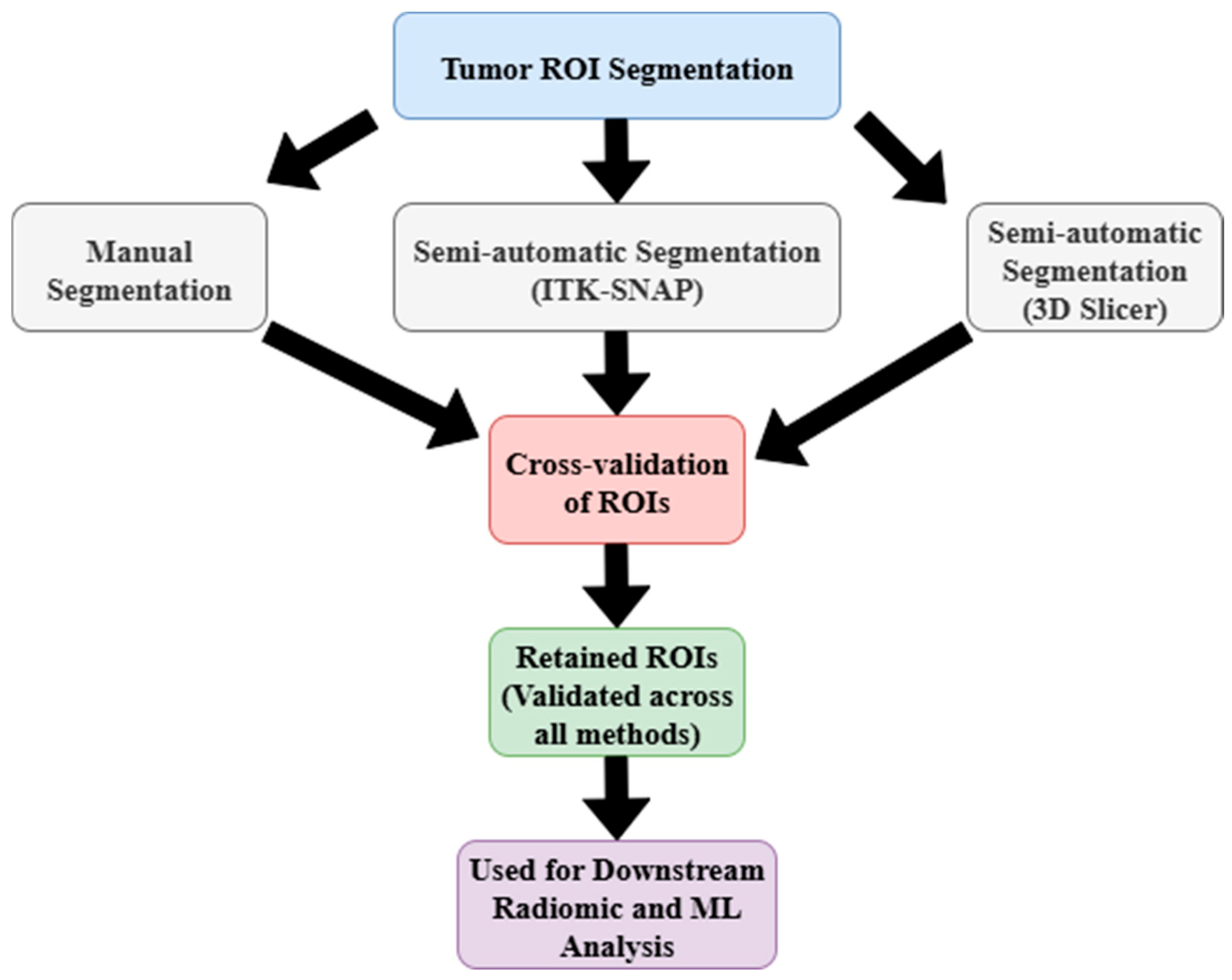 40]. Each tumor was segmented independently using these three methods. Only ROIs showing consistent boundaries across all approaches were retained as final segmentations. This multi-method validation strategy was crucial for minimizing variability and ensuring the robustness of subsequent radiomic analysis (