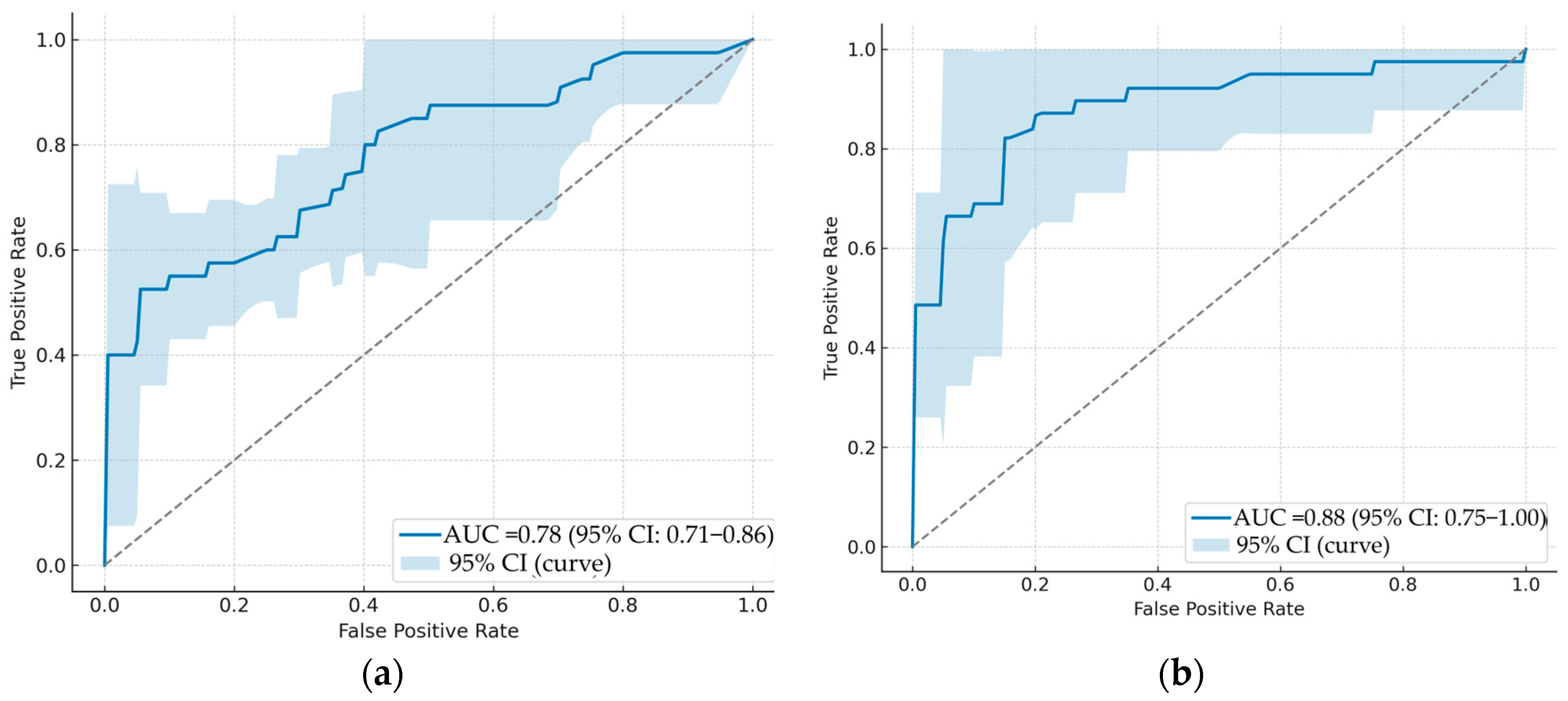 Another methodological consideration concerns the choice of learning framework. Although deep learning approaches, such as convolutional neural networks (CNNs), have demonstrated excellent performance in image-based predictive tasks, their application typically requires large-scale datasets to avoid overfitting. Given the relatively modest cohort size in the present study (n = 138), we opted for Random Forest classifiers, which are more suitable for small and heterogeneous datasets while offering interpretable outputs for clinical translation. Nevertheless, future work with larger, multi-institutional cohorts will investigate CNN-based architectures and hybrid models, which combine handcrafted radiomic features with deep feature representations, in order to benchmark their performance against our current machine learning pipeline.