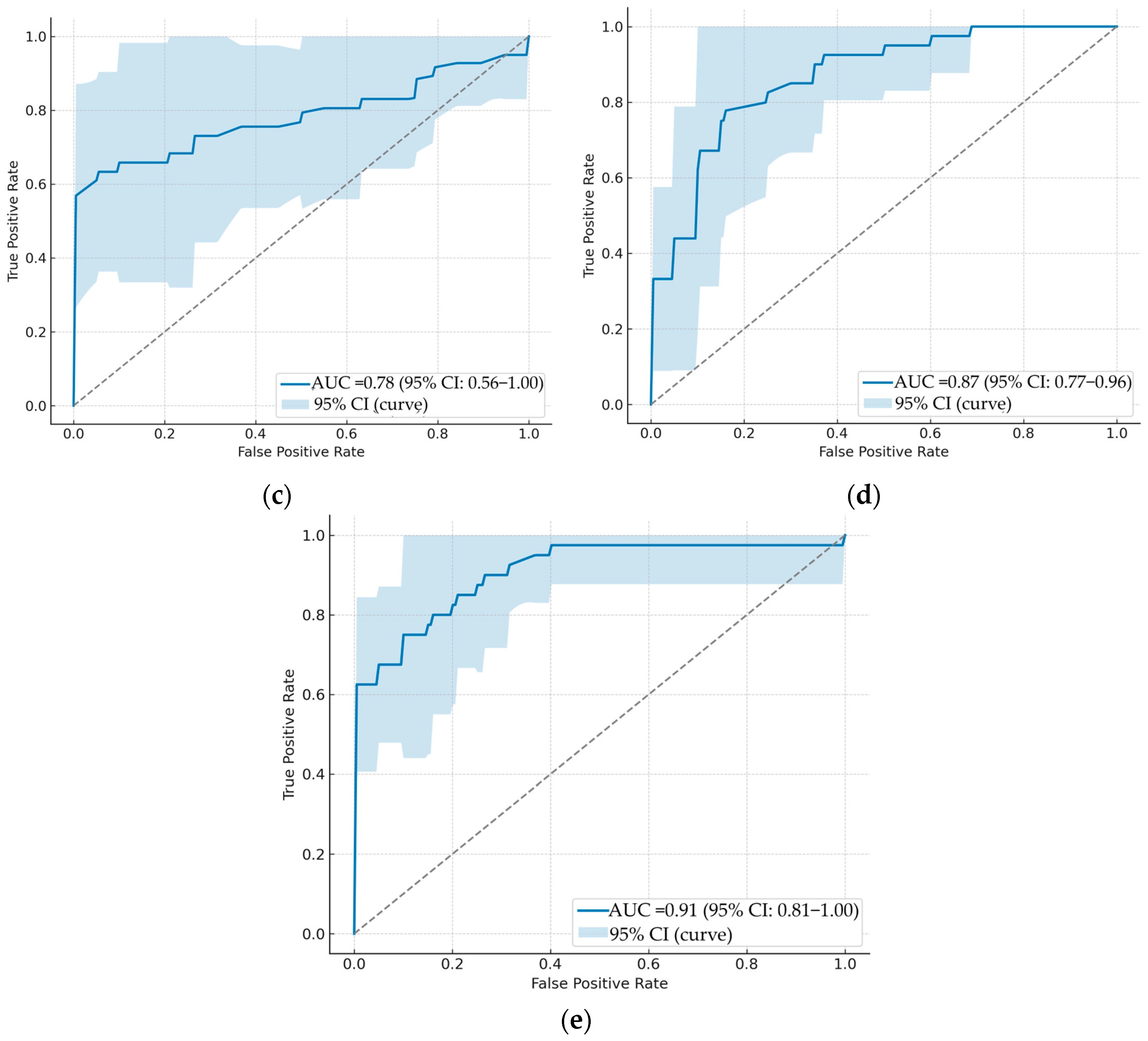 This comparative modeling approach allowed us to assess the relative contribution of each feature type (clinical, morphological (CT), and radiomic), as well as the impact of dimensionality reduction, through selection of the most relevant predictors.