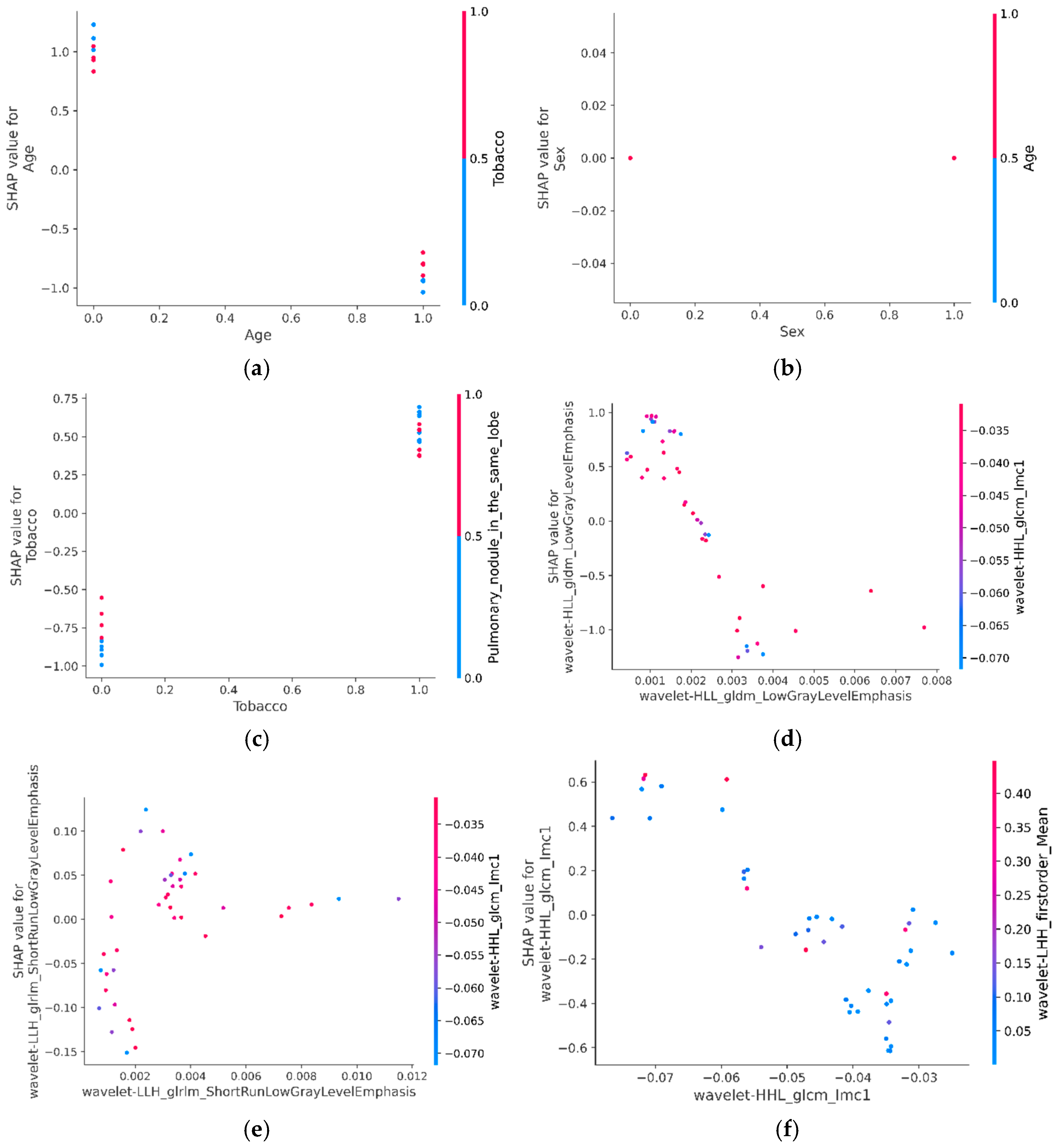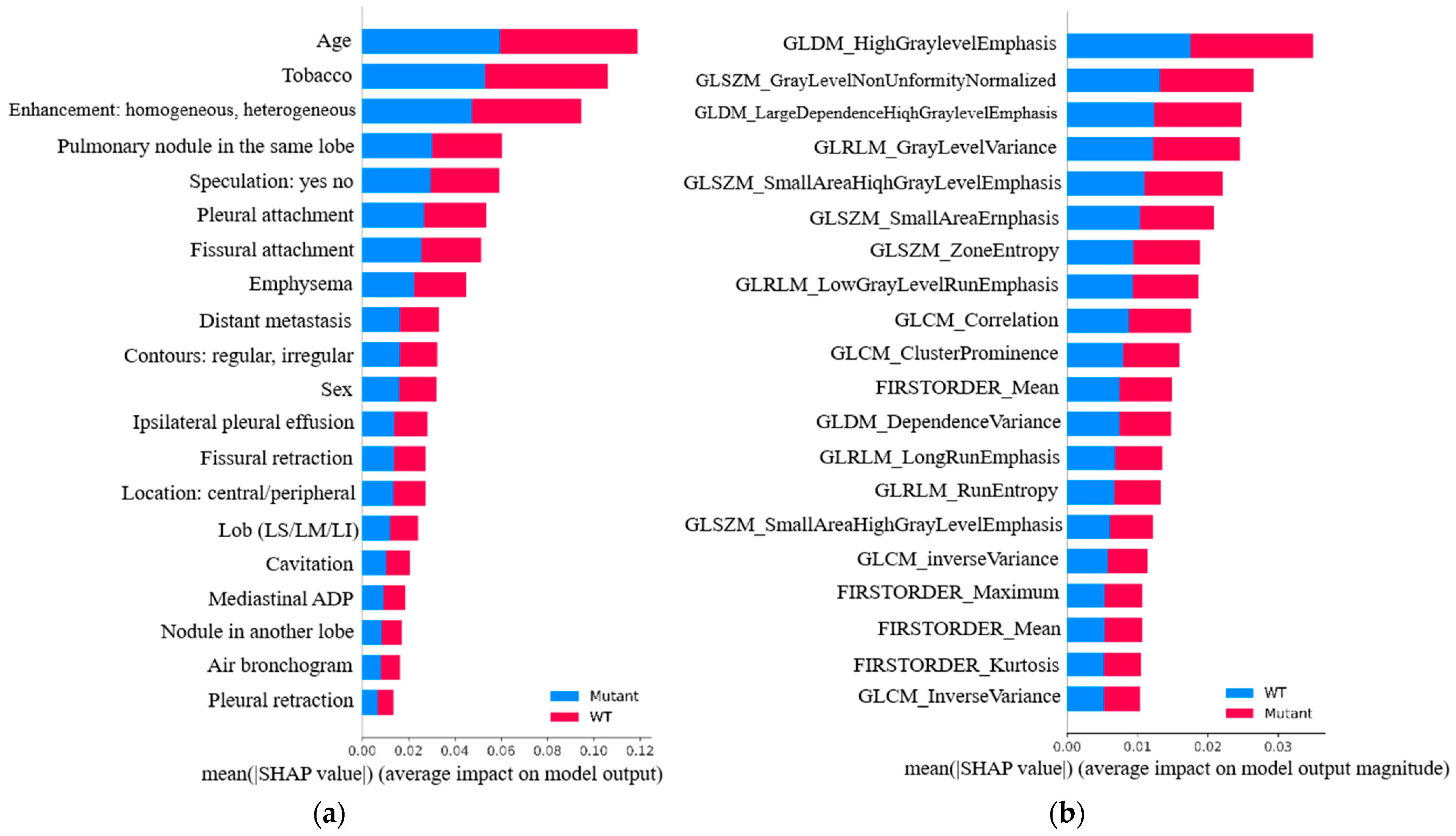 An additional limitation concerns the SHAP analysis of tobacco use, which paradoxically emerged as a positive contributor to predicting EGFR mutation. This finding contradicts established clinical evidence, as EGFR mutations are more prevalent among non-smokers. After verifying the dataset, no variable misencoding was identified, suggesting that this apparent contradiction reflects cohort-specific bias, given the relatively small number of mutant cases (n = 40). This emphasizes that SHAP contributions in small datasets may capture sample-specific distributions rather than general biological associations. Future validation on larger and more diverse cohorts will be required to determine whether this effect persists or diminishes.