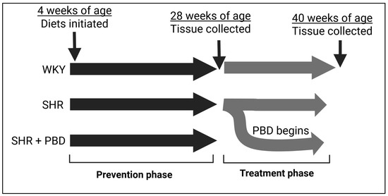 The prevention phase comprised animals consuming their respective diets for 24 weeks, starting from 4 weeks of age (Figure 1). For additional clinical relevance, we also utilized a treatment model, in which a subset of SHRs on the control diet that were hypertensive for 24 weeks were switched to a PBD for 12 additional weeks. Otherwise, rats continued the control diet for 12 weeks during the treatment phase. Figure 1 outlines the animal study design. At the time of sacrifice, SHRs, irrespective of diet, remained hypertensive (systolic BP: ~160 mmHg), while WKYs were normotensive (systolic BP: ~112 mmHg) [18].