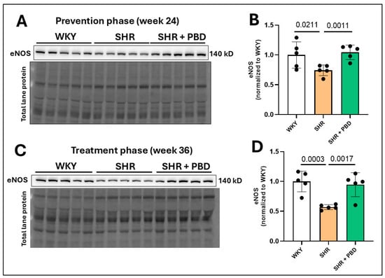 Lung microvascular eNOS protein expression. At 4 weeks of age, spontaneously hypertensive rats (SHRs) consumed either a control purified diet or a plant-based diet (PBD) for 24 weeks. Wistar Kyoto (WKY) rats also consumed the control diet for 24 weeks. Animals were then euthanized (prevention phase). For the treatment phase, a subgroup of SHRs were switched from the control diet to a PBD after 24 weeks, while the remaining WKYs and SHRs continued the control diet for 12 additional weeks. Lung protein was isolated, and eNOS was assessed at (A,B) week 24 or (C,D) week 36 via Western blot. Statistical comparisons were made with Student’s t-test between WKY vs. SHR or SHR vs. SHR + PBD (n = 5/group). Data are expressed as mean ± SD. Abbreviations: eNOS, endothelial nitric oxide synthase; PBD, plant-based diet; SHR, spontaneously hypertensive rat and WKY, Wistar Kyoto.