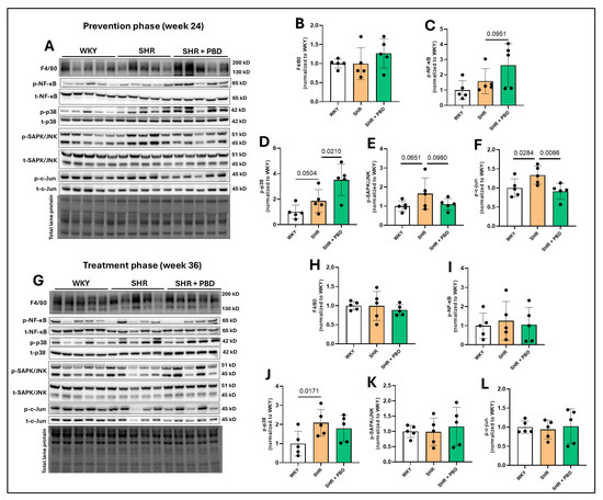 No significant differences in the immune cell infiltration marker, F4/80, were observed between groups at week 24 (Figure 5A,B) or week 36 (Figure 5G,H); nor was the phosphorylation of NF-κB significantly impacted (Figure 5A,C,G,I). However, the phosphorylation of p38, a mitogen-activated protein kinase (MAPK) involved in vascular remodeling [31], was increased in SHRs consuming the control diet vs. WKYs (1.86 ± 0.88 vs. 1.00 ± 0.54, p = 0.0504) and SHR + PBD vs. SHR alone (3.50 ± 1.2, p = 0.0210) at week 24 (Figure 5A,D). At week 36 (Figure 5G,J), differences in phospho-p38 between SHR and SHR + PBD were no longer significant (p = 0.2597); however, the expression of this protein remained elevated in SHRs consuming the control diet vs. WKYs (2.08 ± 0.69 vs. 1.00 ± 0.64, p = 0.0170). At week 24, the expression of phosphorylated stress-activated protein kinases (SAPK)/Jun amino-terminal kinases (JNK) (Figure 5A,E), a protein also involved in vascular remodeling [32], was increased (non-significantly) in SHRs consuming the control diet vs. WKYs (1.65 ± 0.82 vs. 1.00 ± 0.27, p = 0.0651) and vs. PBD (1.10 ± 0.30, p = 0.0980). This change, however, was significant in the phosphorylation of c-Jun (Figure 5A,F), a transcription factor directly activated by SAPK/JNK at week 24. No significant differences were observed in the phosphorylation of SAPK/JNK and c-Jun at week 36 (Figure 5G,K,L).