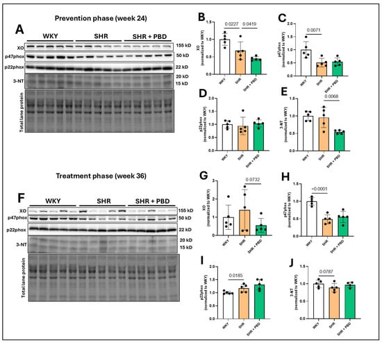The expression of xanthine oxidase (XO), a producer of superoxide, was significantly increased at week 24 (Figure 6A,B) in WKY vs. SHR (1.00 ± 0.17 vs. 0.67 ± 0.25, p = 0.0227) and SHR vs. SHR + PBD (0.67 ± 0.25 vs. 0.44 ± 0.05, p = 0.0419). At week 36, the expression of XO (Figure 6F,G) was no longer significantly different between WKY and SHR (p = 0.25), while PBD supplementation non-significantly reduced XO expression vs. SHR alone (1.40 ± 1.11 vs. 0.55 ± 0.38, p = 0.0732). The expression of the NADPH-oxidase 2 subunit, p47phox, involved in the production of superoxide, was significantly reduced at week 24 (Figure 6A,C) and week 36 (Figure 6F,H) in SHRs consuming the control diet vs. WKYs, with no effect of PBD supplementation. The expression of the NADPH-oxidase subunit p22phox, which is ubiquitous among NADPH-oxidase isoforms, was not changed between groups at week 24 (Figure 6A,D), but was significantly increased in SHRs consuming the control diet vs. WKYs (1.17± 0.05 vs. 1.00 ± 0.05, p = 0.0185) at week 36 (Figure 6F,I). As a proxy for oxidative stress, the expression of 3-nitrotyrosine (3-NT) was not changed between WKY and SHR at week 24 (Figure 6A,E). In contrast, PBD supplementation significantly reduced 3-NT expression vs. SHRs consuming the control diet (0.54 ± 0.05 vs. 0.95 ± 0.28, p = 0.0068). At week 36, however, during the treatment phase, the expression of 3-NT (Figure 6F,J) was non-significantly reduced in SHRs consuming the control diet vs. WKYs (0.88 ± 0.12 vs. 1.00 ± 0.10, p = 0.0787), with no effect of PBD supplementation observed (p = 0.1369).