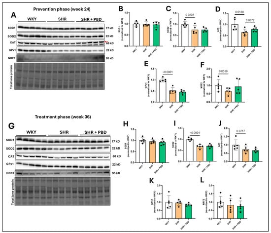 The expression of the antioxidant enzyme, superoxide dismutase (SOD)1, which neutralizes superoxide in the cytosol, was not significantly different between groups at week 24 (Figure 7A,B) or week 36 (Figure 7G,H). However, SOD2, a mitochondrial superoxide-neutralizing protein, was significantly reduced at week 24 (Figure 7A,C) in SHRs consuming the control diet vs. WKYs (0.75 ± 0.18 vs. 1.00 ± 0.13, p = 0.0007), which reduced further at week 36 (Figure 7G,I) in SHR, relative to WKY (0.67 ± 0.08 vs. 1.00 ± 0.06, p < 0.0001). PBD did not significantly impact the expression of SOD2 at any time point. The antioxidant enzyme catalase (CAT), a protein that converts hydrogen peroxide to water, was significantly reduced in SHRs consuming the control diet vs. WKYs (0.64 ± 0.14 vs. 1.00 ± 0.0.25, p = 0.0138) at week 24 (Figure 7A,D), for which PBD supplementation attenuated (0.78 ± 0.11, p = 0.0672). Differences in CAT were no longer statistically significant between groups at week 36 (Figure 7G,J). Glutathione peroxidase (GPx)1, an enzyme that also neutralizes hydrogen peroxide, was significantly reduced at week 24 (Figure 7A,E) in SHRs consuming the control diet vs. WKYs (0.52 ± 0.13 vs. 2.00 ± 0.08, p < 0.0001). PBD supplementation did not significantly change GPx1 expression relative to SHRs alone (p = 0.2045). No significant differences in GPx1 expression were observed between groups at week 36 (Figure 7G,K). The expression of nuclear factor erythroid 2-related factor 2 (NRF2), a transcription factor and regulator of glutathiones, was reduced (non-significantly) at week 24 (Figure 7A,F) in SHRs consuming the control diet vs. WKYs (0.67 ± 0.19 vs. 1.00 ± 0.35, p = 0.0519). PBD supplementation did not significantly impact the expression of NRF2 relative to HSR (p = 0.1314). At week 36, however, there were no significant differences in the expression of NRF2 between groups (Figure 7 G,L).