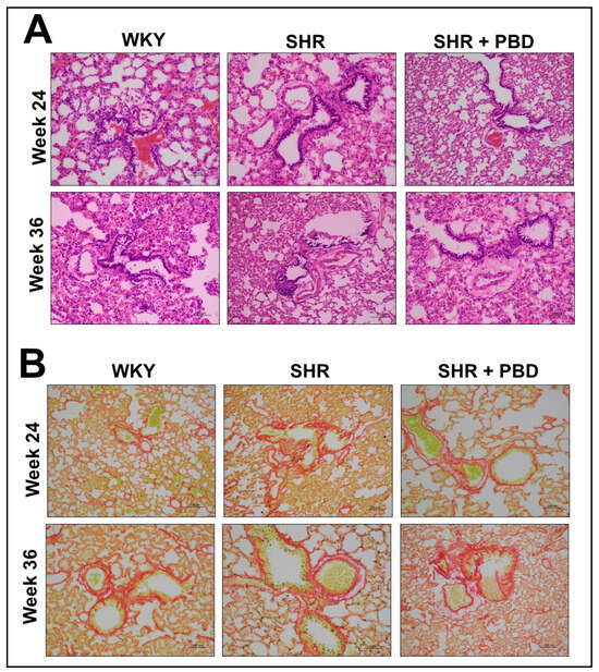 No pathological alterations in lung architecture or blood vessels were observed between WKY and SHR, with similar observations found in SHR + PBD (Figure 8A). Similarly, no significant differences in collagen were observed via Sirius red staining (Figure 8B).