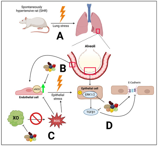 Overall hypothesized mechanisms by which a PBD favorably impacts the lungs in essential hypertension. A major cause of this stress is microvascular endothelial dysfunction. (A) Essential hypertension can lead to pulmonary hypertension and lung stress. (B) Compromised eNOS can drive epithelial stress. A PBD preserves the expression of eNOS, thus potentially improving microvascular endothelial dysfunction. (C) A PBD inhibits XO expression, likely reducing the release of superoxide, a form of ROS, which can compromise endothelial function and drive epithelial stress. (D) The phosphorylation of ERK1/2 can increase TGFβ1 activity, resulting in reduced E-cadherin, compromising barrier function. However, a PBD attenuated these molecular abnormalities. Created in BioRender. Najjar, R. (2025) https://BioRender.com/f926qw3. Biorender publication agreement number: MX28YBH0G6.