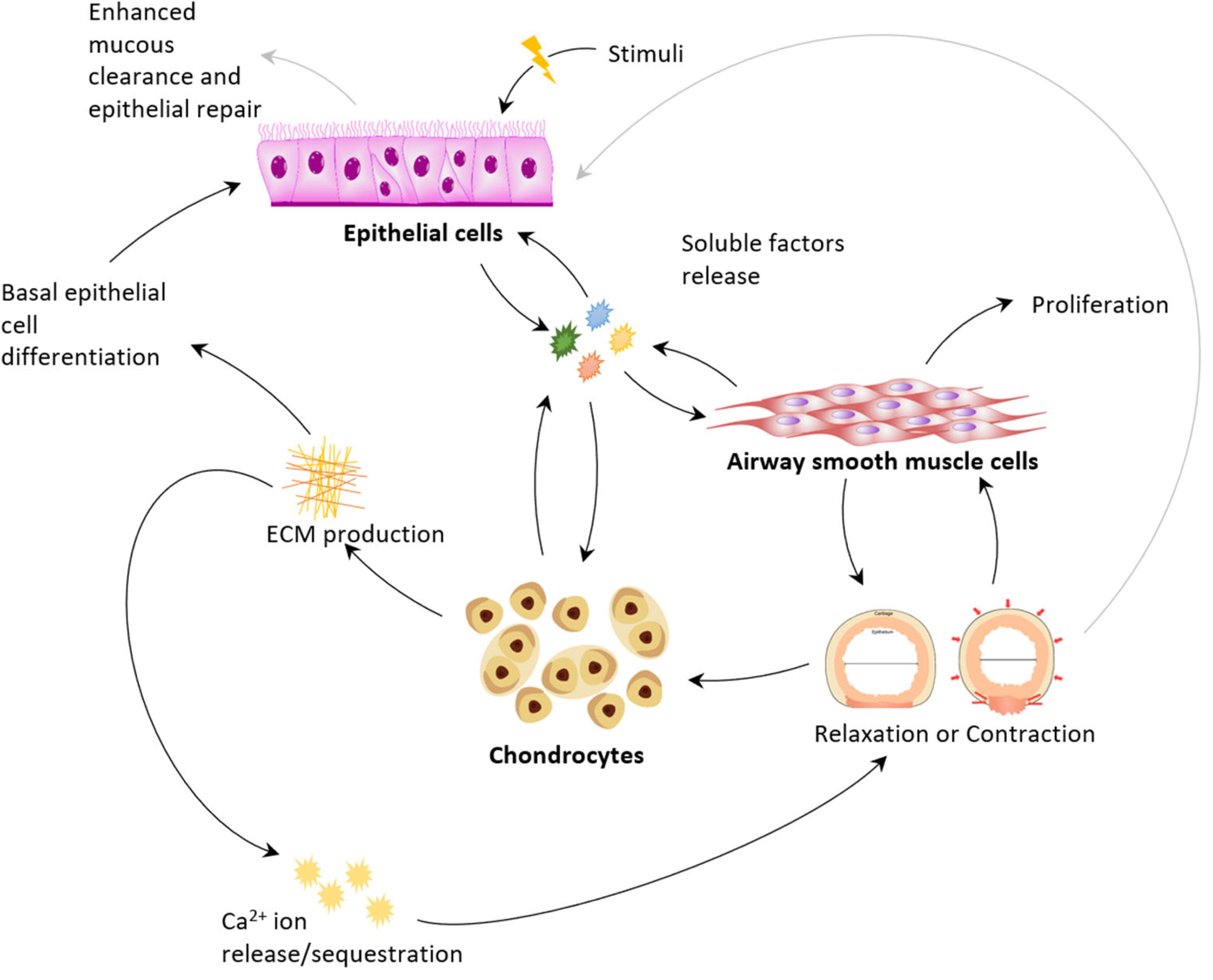 - A novel cellular specialization framework defining epithelial cells as environmental activators, smooth muscle as mechanical actuators, and chondrocytes as calcium-dependent regulators in airway homeostasis.