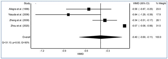 A meta-analysis was performed using MetaXL (EpiGear International Pty Ltd., Sunshine Coast, Australia, version 5.3). The effect of carbocisteine on exacerbation rates was reported as weighted mean difference (WMD) with 95% confidence intervals (CI) using a random-effects model, while adverse events were analyzed using pooled odds ratios (OR) with 95% CI, calculated with the Mantel–Haenszel method under a random-effects model. A random-effects model was applied to account for expected heterogeneity due to differences in study populations, study durations, baseline exacerbation rates, and geographic variations in COPD management. Statistical heterogeneity was assessed using Cochran’s Q test and I2 statistic. A p-value < 0.10 in Cochran’s Q test indicated significant heterogeneity, while I2 > 50% suggested substantial variability among studies.