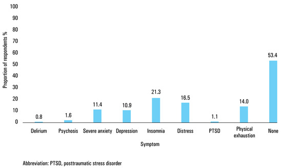 Although we did not observe high proportions of reports of severe negative mental health outcomes, such as delirium, psychosis, or PTSD, there were relatively high rates of reported anxiety, depression, insomnia, and distress. All symptoms except insomnia were more likely to be reported by younger urologists. Older urologists were also more likely than their younger counterparts to report having no mental health symptoms at all.