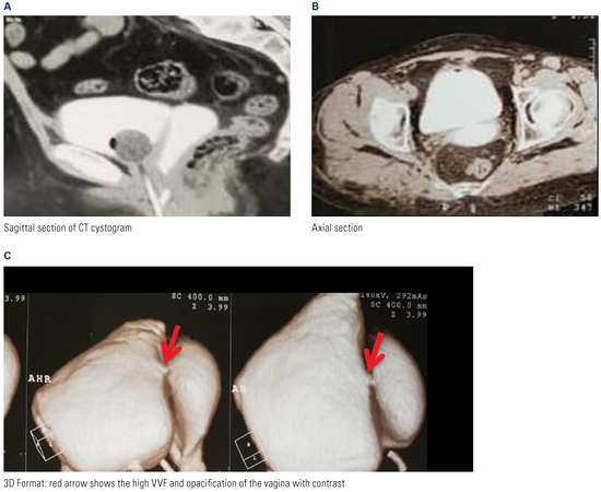 Between 2013 and 2018, 94 consecutive female patients with high vesicovaginal fistula or previous vaginal surgery that precluded transvaginal fistula repair were randomized to fistula repair by an extravesical transabdominal technique (n = 47) or by a transvesical transabdominal technique (n = 47) at our center. Preoperative patient evaluation included history, physical examination (local vaginal examination, inspection with speculum, dye test), and CT cystogram (Figure 1). Informed consent was obtained from all patients prior to surgery, and institutional review board approval was granted.