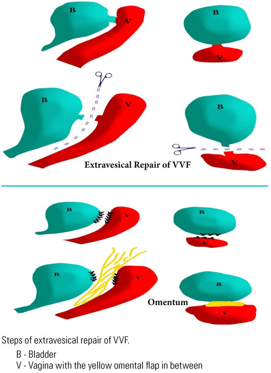 The extravesical approach, first described by Von Dittel in 1893 [9], focuses on targeted dissection, avoiding cystotomy, and preferentially dissecting to the fistulous tract via the vesicovaginal plane. The superiority of either the transvesical or the extravesical approach has not been established in the literature and at the time of writing, no study has compared the 2 techniques [10].