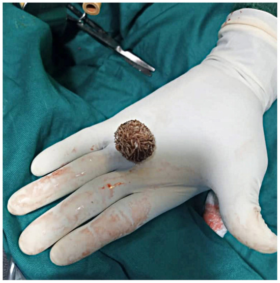 A stone from the urinary bladder via open cystolithotomy.
