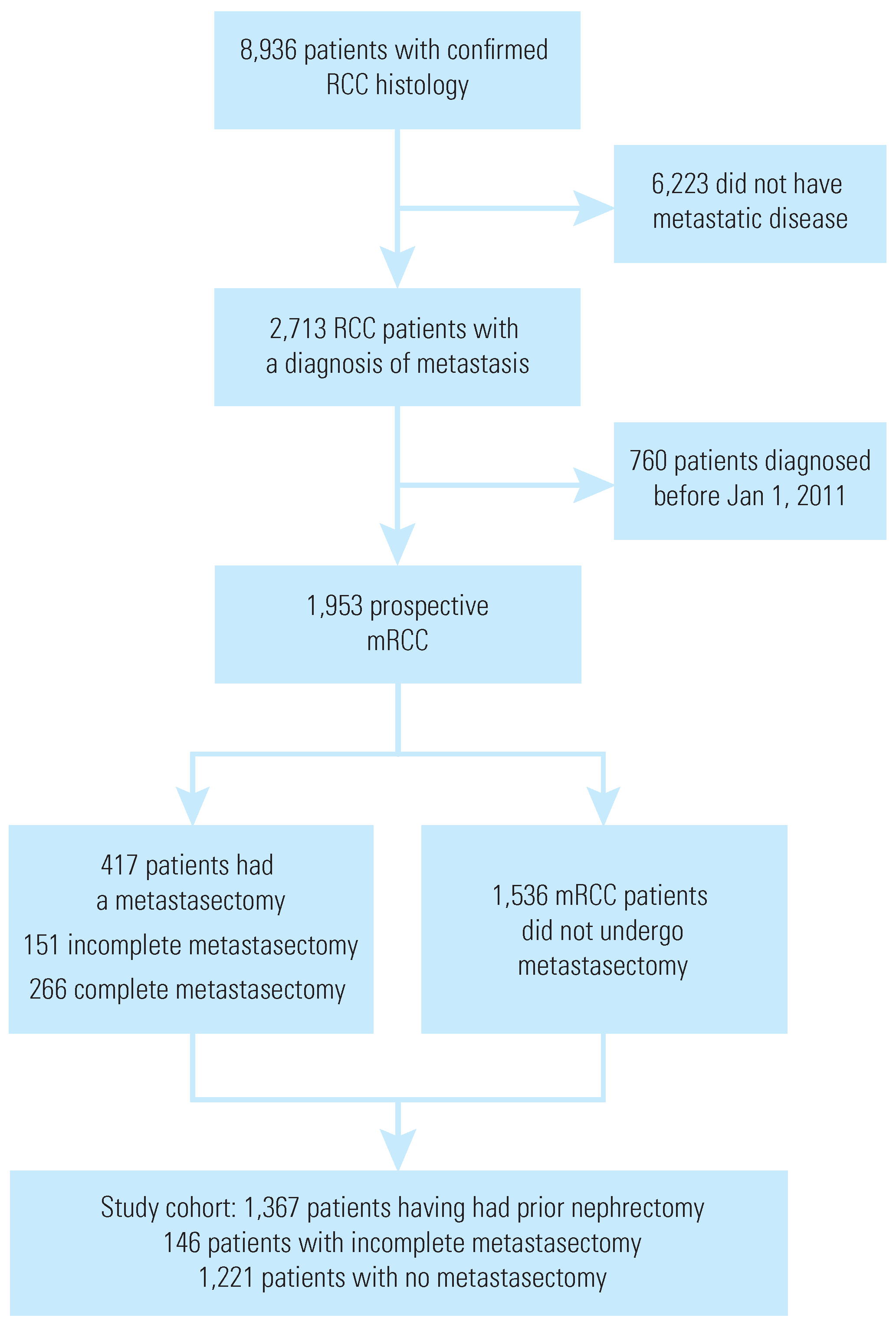 Medical records of patients diagnosed with mRCC who underwent radical or partial nephrectomy between January 2011 and April 2019 were reviewed. Patients receiving a CM were excluded and were reported separately [