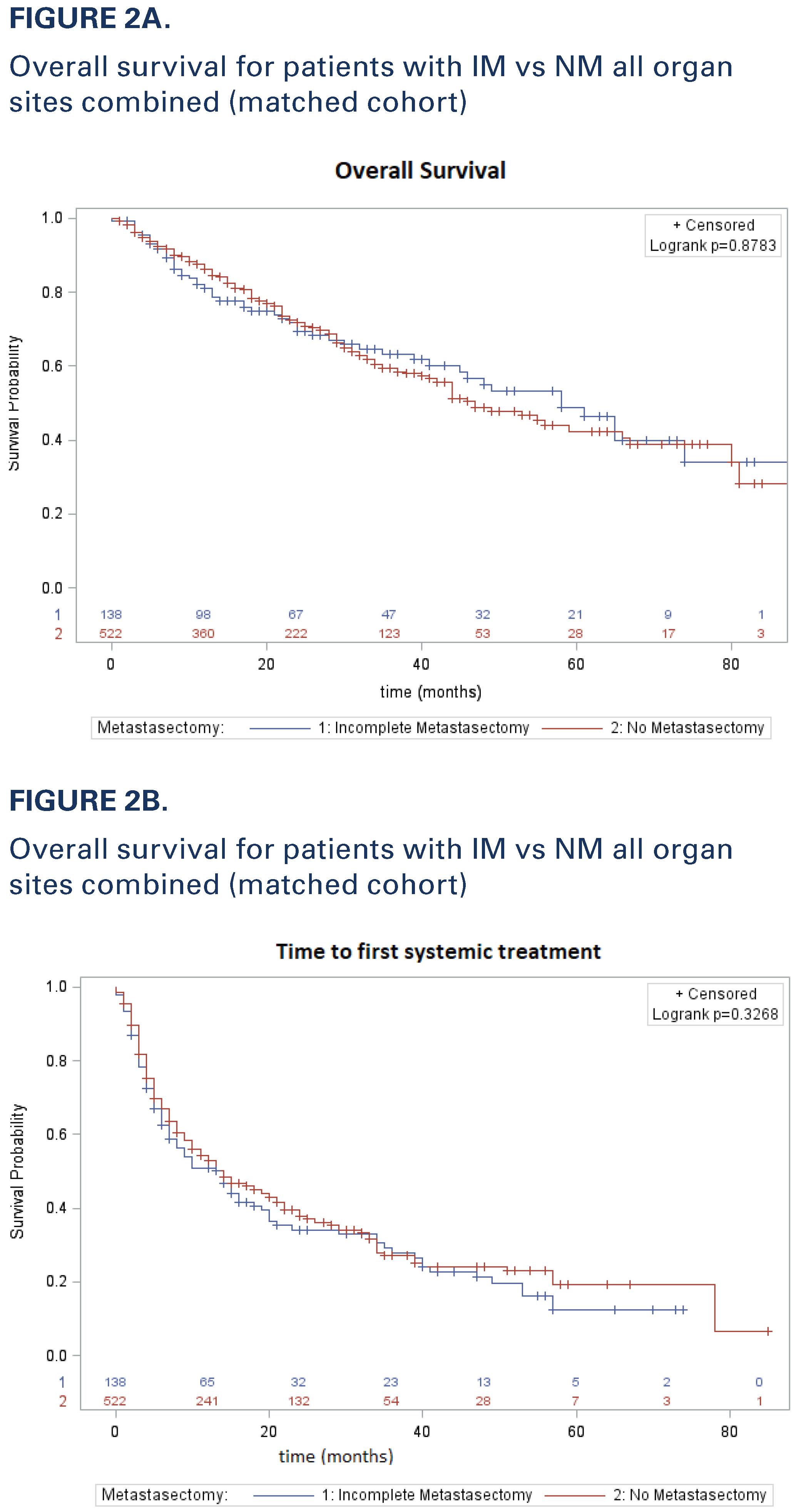 The main limitation of our study arises from its retrospective nature. Also a selection bias may have occurred with respect to the patient’s characteristics. Indeed, patients with a worse general condition may have been deemed unfit for surgery and were selected in the NM group. We performed a propensity score analysis along with matching analysis to address this limitation. Propensity score estimation was carried for variables such as age, sites and number of metastases, disease synchronicity, and histology, and each patient undergoing incomplete surgical resection was matched with up to 4 patients among those who did not have a metastasectomy for variables deemed associated with treatment choice, including prior use of systemic therapy. This analysis allowed us to balance these clinicopathologic variables and drastically limit selection bias. With the exception of the number organs involved by metastasis, all were balanced in the final cohort. Interestingly, patients in the IM group had a higher percentage of patients with 2 or more organ sites involved than did the NM group. Additionally, patients in the IM group had a higher rate of hypertension, diabetes, and hypercholesterolemia, and were more likely to be smokers. Therefore, despite having more comorbidities and a higher disease burden, a significant improvement in OS and delay to introduction of systemic therapy was obtained for lung IM. Unfortunately, no multivariate analysis was possible because of the limited number of patients in the analysis stratified by metastasis location. Our results show potential benefits of IM for lung metastasis only, compared with NM; however, our multivariate analysis found that having a lung metastasis was not a predictive factor for OS when compared with other metastasis location. Furthermore, a better survival was observed for patients receiving IM for lung metastasis only in comparison with IM for other single metastasis locations such as endocrine, lymph nodes, and bones. Again, the small number of patients in each group made impossible a multivariate analysis or another alternative method, ie, matching strategy. Another limitation is the lack of quality of life (QoL) assessment post-metastasectomy. IM may negatively affect patient’s QoL, especially when performed in a non-palliative setting. Future comparative trials for different modalities for metastasectomy such as stereotactic body radiation therapy versus surgery versus cryotherapy may shed more light on not only potential survival benefits of one modality compared with the other, but also on improvement in patients’ QoL. Lastly, the patients’ list of medications was unavailable. Some medications, such as metformin or angiotensin converting enzyme inhibitors, may alter survival in metastatic renal cell carcinoma patients [